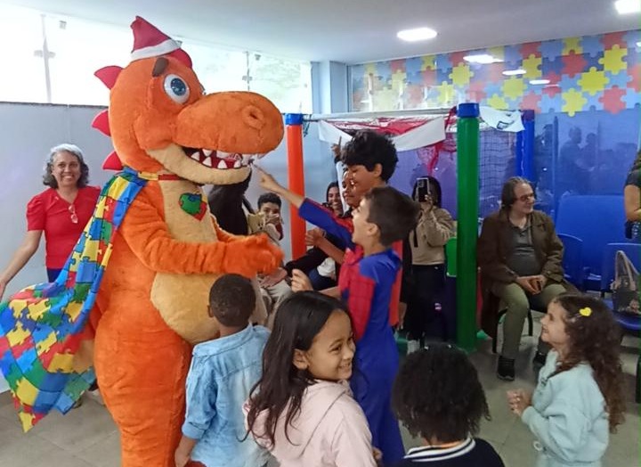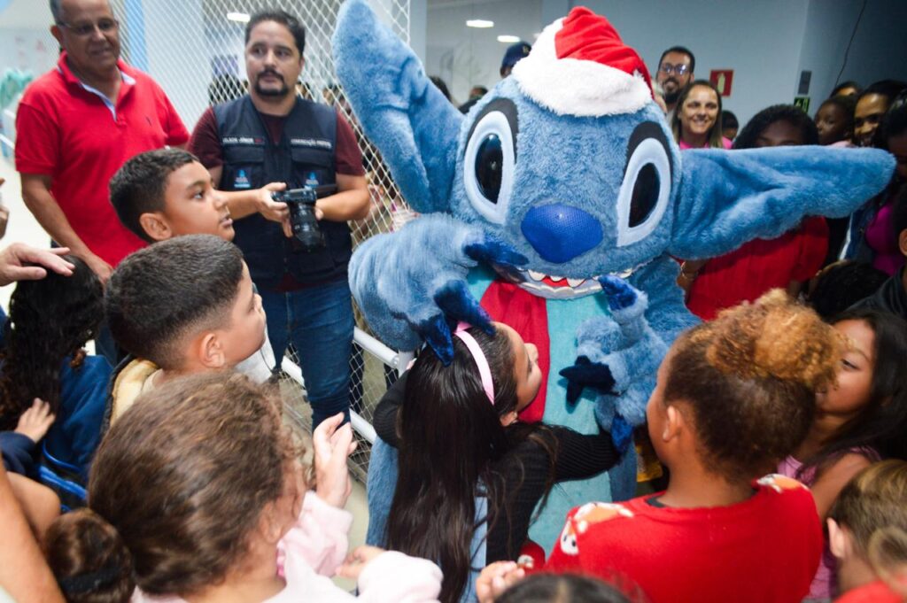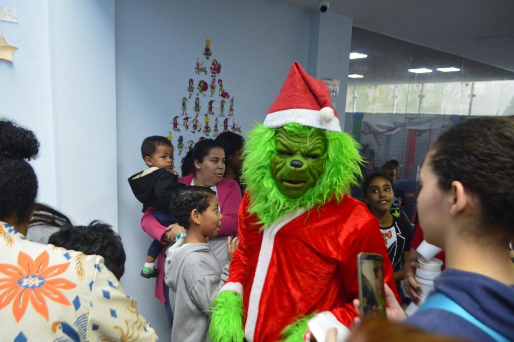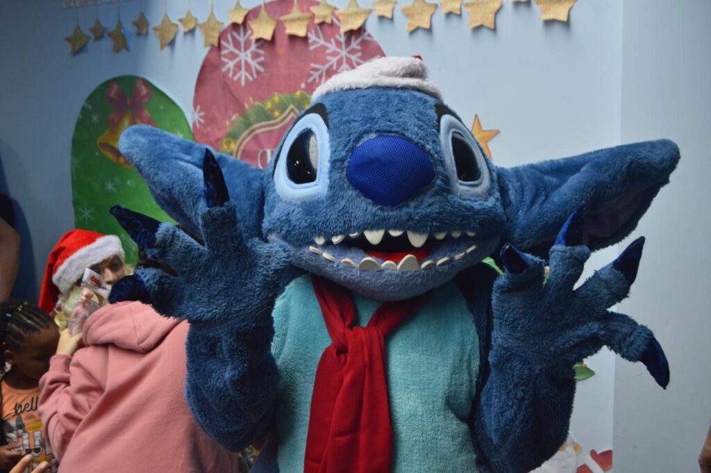 Para tornar o momento ainda mais lúdico e divertido, personagens queridos marcaram presença, como Stitch, o mascote Espectrossauro e o Grinch. Eles levaram alegria, despertaram risadas e garantiram uma atmosfera leve e acolhedora, onde cada criança pôde se sentir à vontade para brincar, interagir e viver plenamente aquele momento.